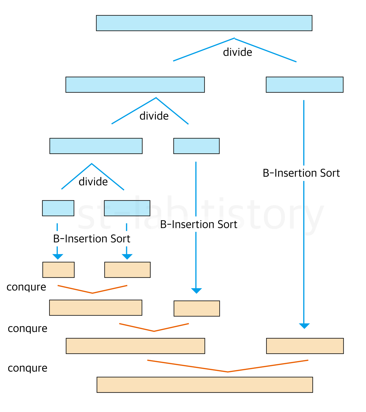 (1) 현재 배열을 반으로 쪼갠다. 배열의 시작 위치와 종료위치를 입력받아 둘을 더한 후 2를 나눠 그 위치를 기준으로 나눈다.