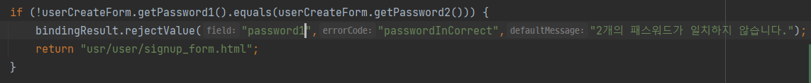bindingResult.rejectValue("password1","passwordInCorrect","2개의 패스워드가 일치하지 않습니다.");