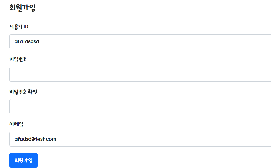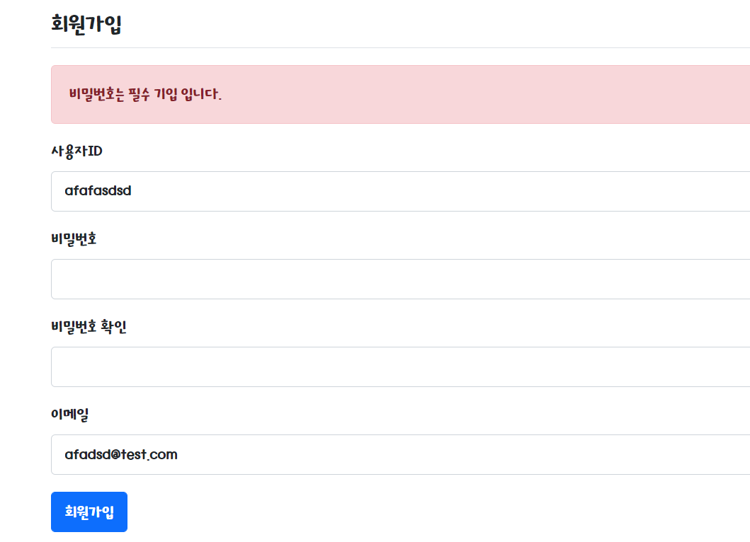 - bindingResult.reject("signupFailed", "이미 등록된 사용자입니다."); 에러 발생시 오른쪽 메시지를 출력한다.